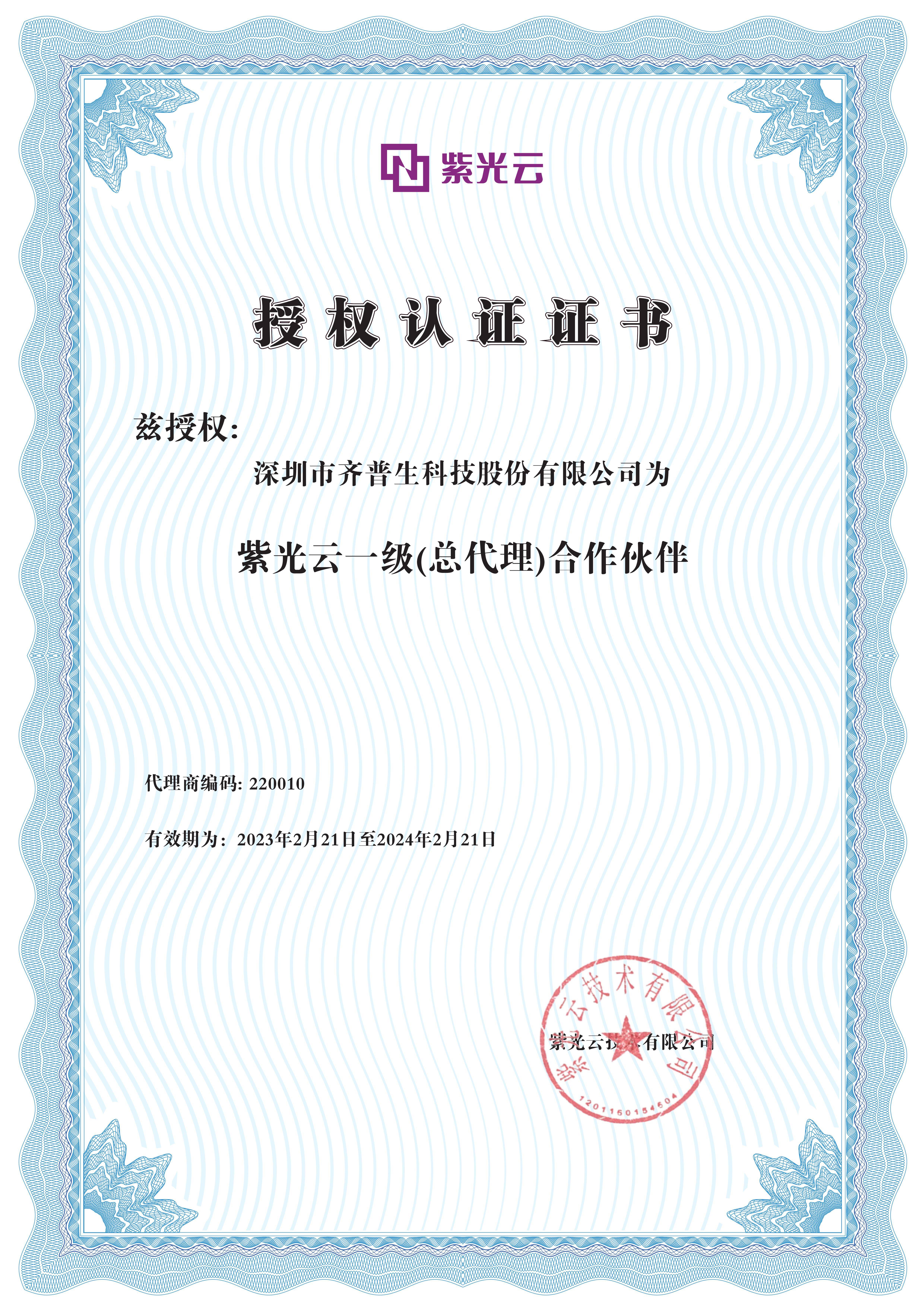 • 紫光云總代理證書(shū)