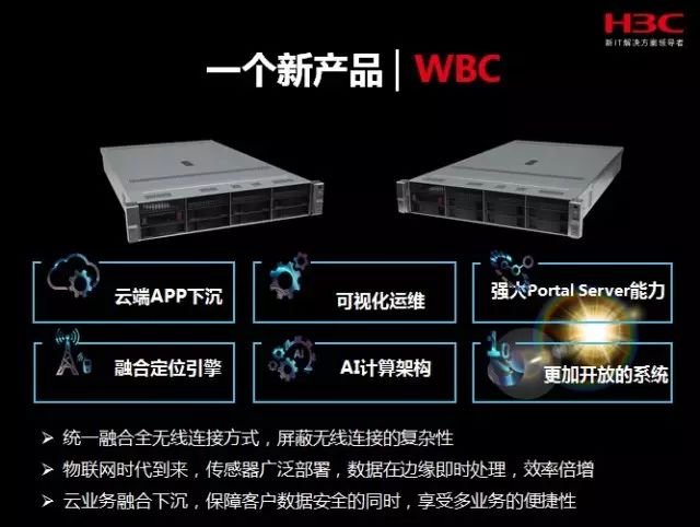 新華三在此次大會上,正式對外發布了WBC(Wireless Beneath Cloud Controller無線多業務控制器),作為新華三無線領域的重磅新品面向市場,融合多種無線技術,具備六大特性:云端APP下沉、可視化運維、強大Portal Sever能力、融合定位引擎、AI計算架構和更開放的系統。面對萬物互聯時代,傳感器廣泛部署,WBC不僅可以實現數據在邊緣即時處理,還可以使得效率倍增;此外,WBC還將運維、認證、位置大數據、SaaS應用等業務下沉到網絡中,在保障客戶數據安全的同時,更享受多業務處理的便捷性。