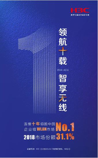 近日, 全球權威ICT市場研究機構IDC發(fā)布的《中國WLAN市場跟蹤報告,18Q4》顯示,紫光旗下新華三集團以31.1%的市場份額位居2018年中國企業(yè)級WLAN市場第一。從2009年到2018年,新華三已連續(xù)十年蟬聯(lián)中國企業(yè)級WLAN市場占有率第一,成為當之無愧的行業(yè)領袖,彰顯了新華三在WLAN領域領先的技術實力與始終如一的可靠品質。